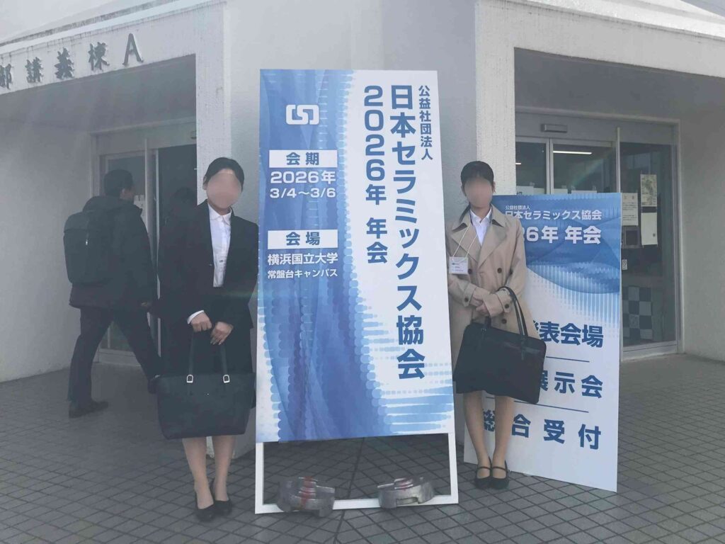 横浜国立大学で開催された日本セラミックス協会2026年年会に参加し、B4の判治さんと渡邉さんが発表を行いました。さまざまな研究内容に触れることができ、良い刺激となったようです。